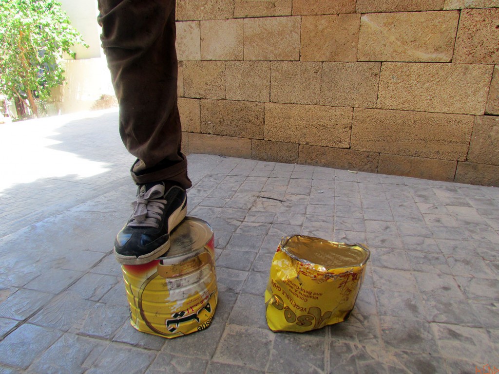 “My Boys,” my recent piece in Salon. I can’t help but suspect that his inspiration for this composition came from the trauma of seeing his uncle’s leg shot off in the Syrian war–an incident which comes up often in conversation. After Assad told me exactly how he wanted this photo shot, I dutifully picked up my camera–as he began balancing on one of the cans he usually sits on to shine shoes…