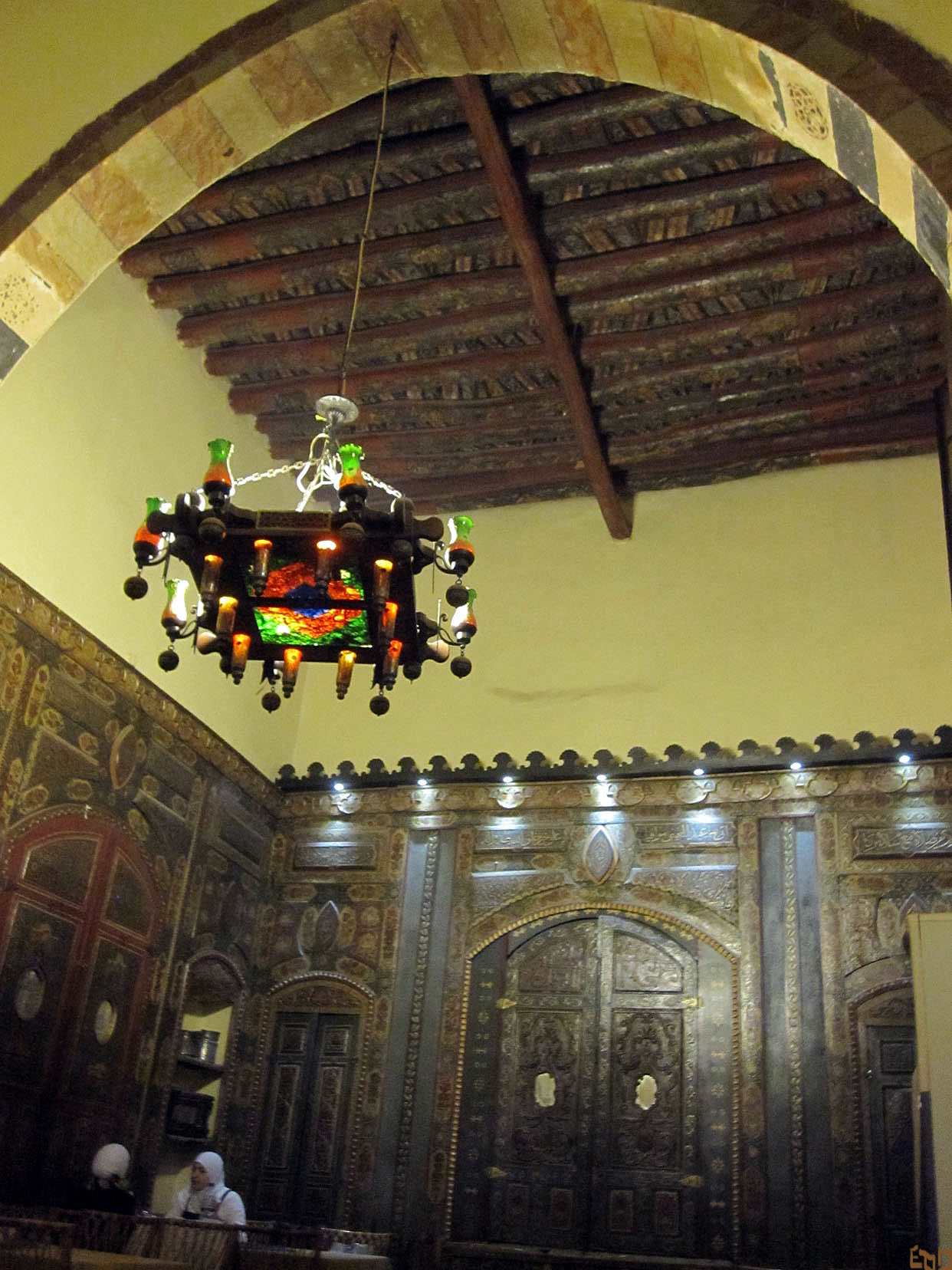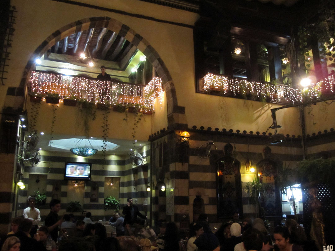 How could I forget that I have photographs of the elaborate woodwork and ablaq interior of my absolute favorite restaurant in Damascus? Surprisingly, when I had dinner there, there weren’t any other foreigners–which means I must have been in the right place. The beauty of the restaurant speaks for itself. It was hard to get up and leave after enjoying my luscious lentil soup, since I knew I may never be able to return…