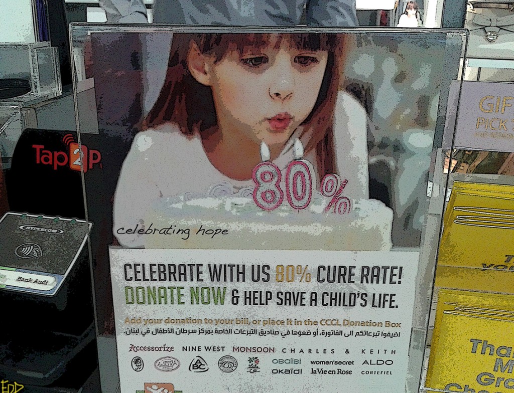 While I was volunteering this afternoon at the Children’s Cancer Center of Lebanon/St. Jude in Beirut, the kids and I played a few rounds of Arabic Bingo–while one of their mothers played spirited Sufi songs on her phone. After my shift was over, I stopped in a store on my way home to shop for some summer sandals–and found the sign below for CCCL/St. Jude at the register. To make an online donation to support the cancer treatment of my young friends in Beirut, please click here.