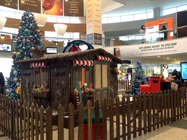 Traveling this month between several countries in the Middle East and Africa, I’ve had time to explore Christmas decorations this holiday season in a few different airports. On my way to Sudan, I stopped to admire this gingerbread house on display in the Beirut airport…
