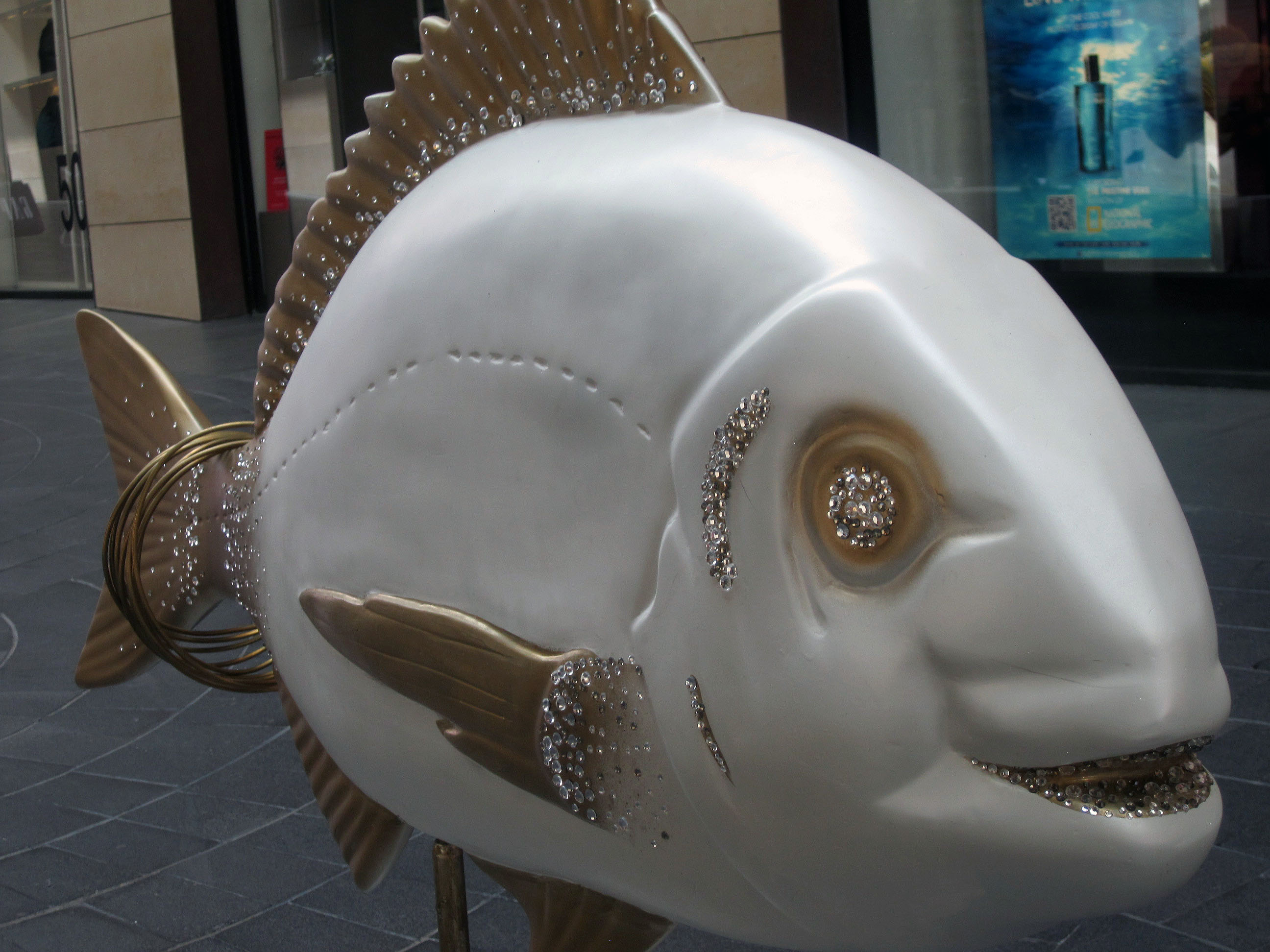 Each fiberglass fish I’ve been posting has been made to resemble a Lebanese dorade–otherwise known as my daily swimming buddies in the sea. Fifty artists took part in making each one of these fish unique–with colorful flowers, graffiti, jewels, and calligraphy. At the end of the exhibition, the fish will be auctioned off to raise funds for sick children–through organizations like Toufoula, which creates “Dream Rooms” using art, music and lighting to provide relaxing and comforting rooms for sick children.