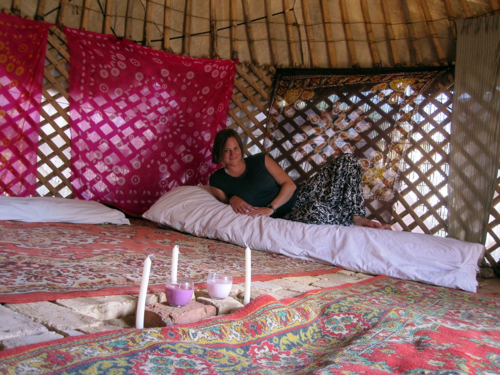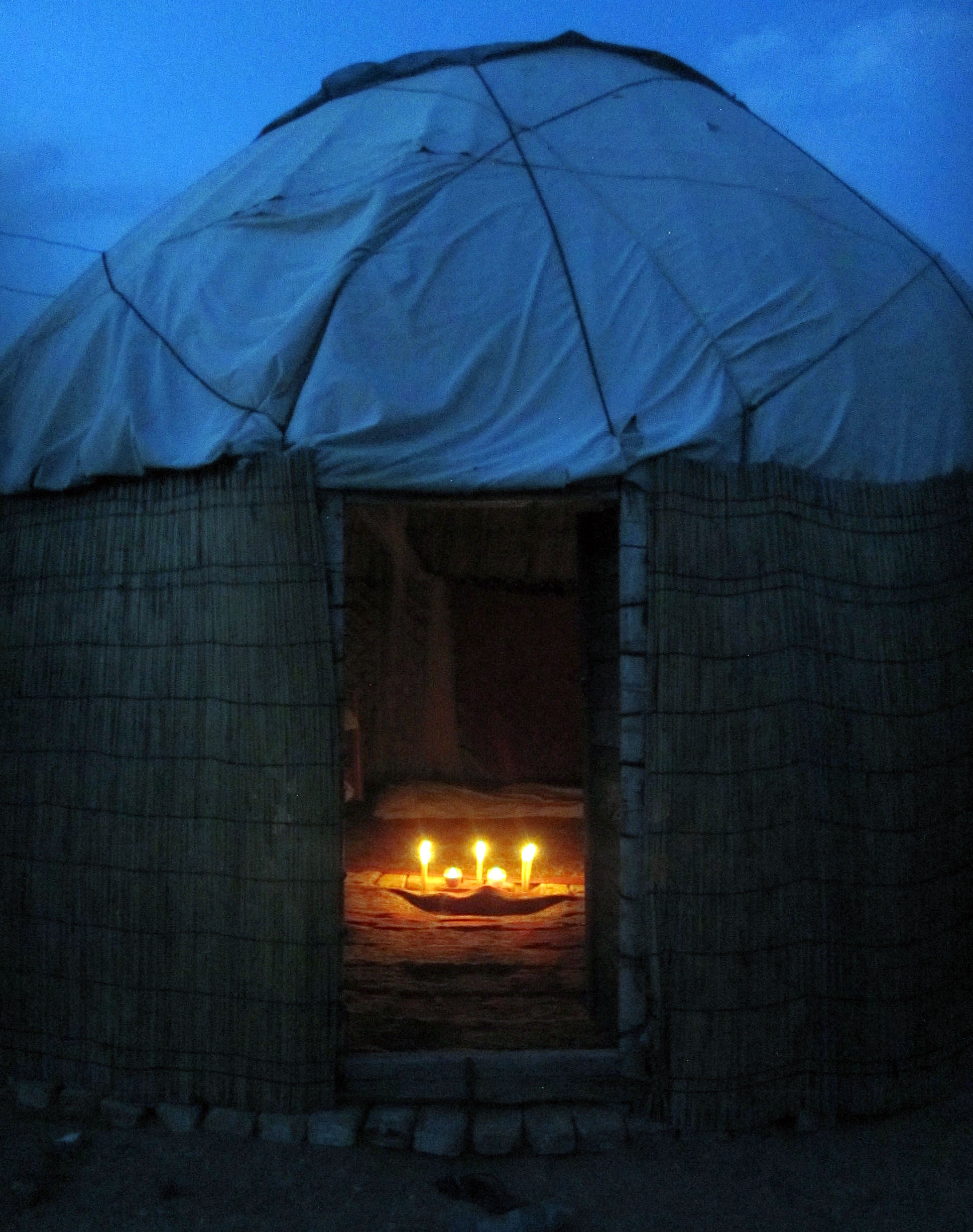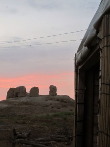 When I arrived at our dig site this past summer in Turkmenistan, and found an abandoned yurt being used as a storehouse–I thought immediately of Bill, and knew what I had to do. My yurt buddy and I rolled up our sleeves and began cleaning out years of debris, dirt and dust. Our colleagues lent us some rugs to cover the floor, and we found mattresses to use as beds. Since we were in the desert, I didn’t have many materials to spruce the place up–but I managed to find some scarves and candles in the bazaar.