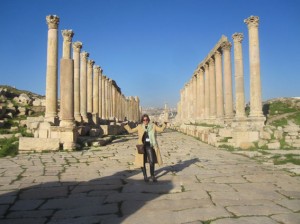 Emily O'Dell walking like an Egyptian near Egyptian granite at Jerash in Jordan with the World Archaeological Congress