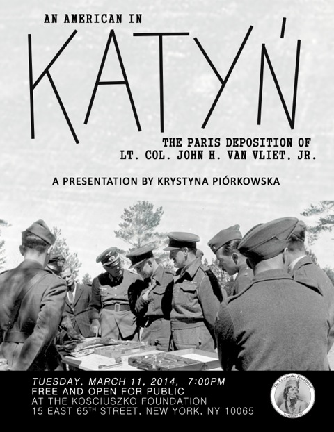 This upcoming event in NYC will discuss the recent discovery of vital testimony from a U.S. officer who in 1943 was forced by the Nazis to watch as they exhumed thousands of Polish officers who had been killed on Stalin’s orders in the Katyn forest. Krystyna Piorkowska uncovered the Paris-dated testimony–given by former American prisoner of war Lt. Col. John H. Van Vliet Jr. on May 10, 1945–in the U.S. National Archives, along with other World War II documents from the U.S. Embassy in Paris.