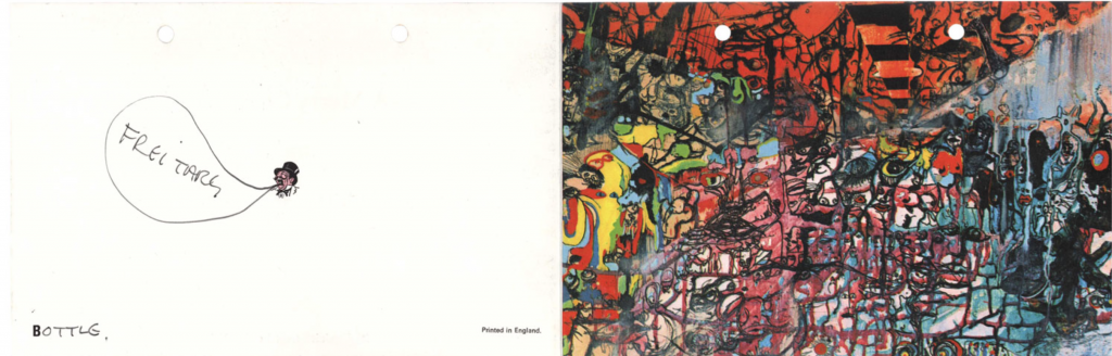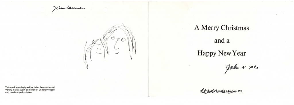 Here’s a holiday postcard that John Lennon and Yoko Ono sent to Karlheinz Stockhausen in 1969. Stockhausen’s image appears on the “Sgt. Pepper” album cover–top row, fifth from the left…