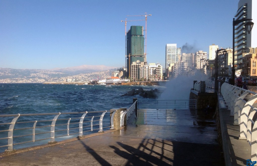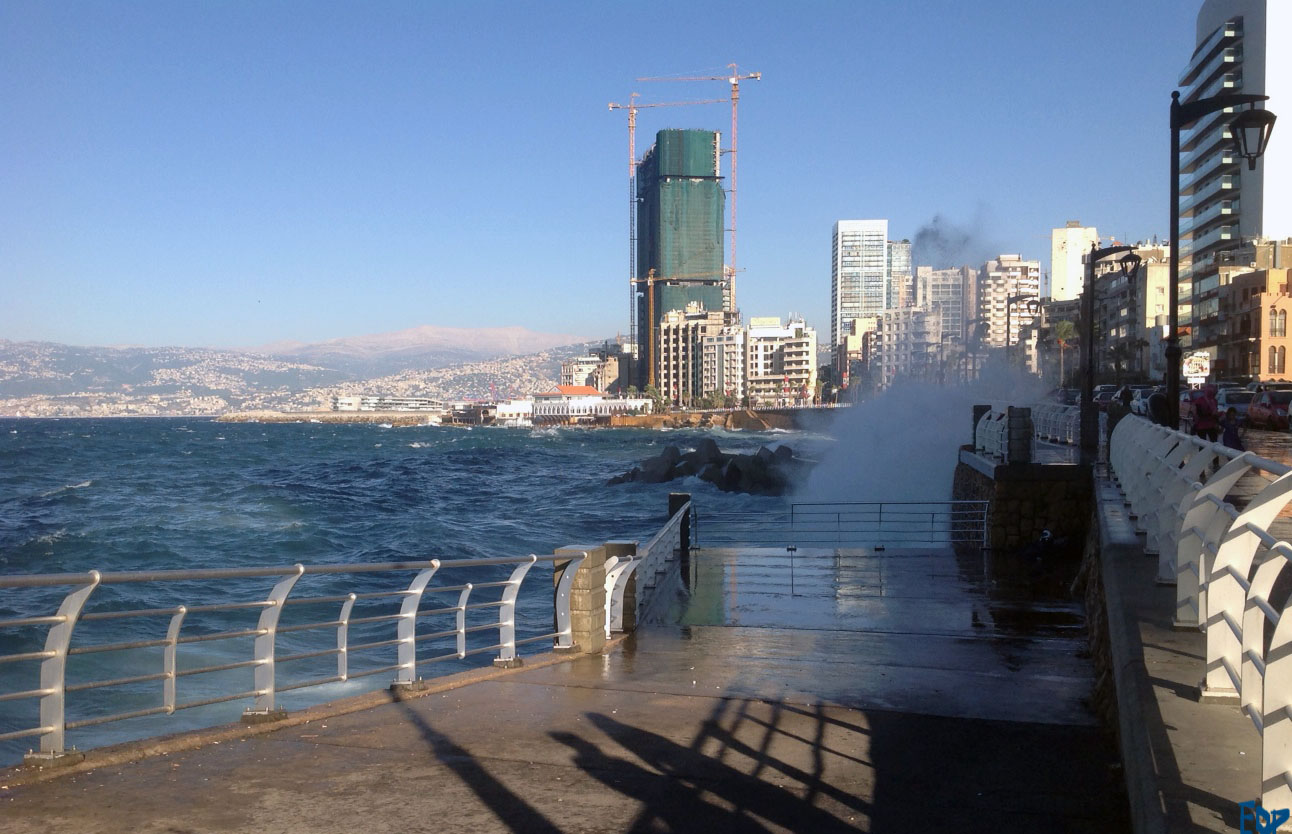 Beirut was overtaken today by waves–pounding up against the rocks and leaping over the sea wall on to the street…