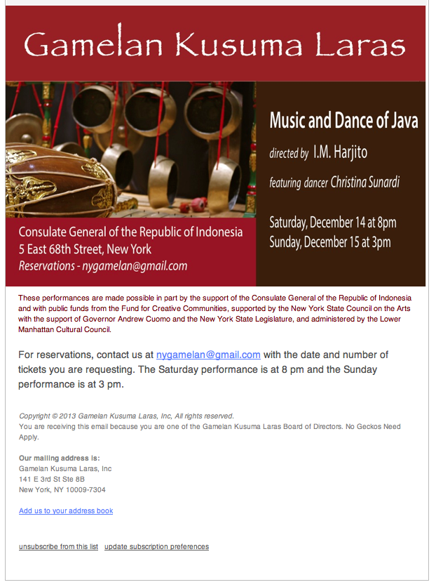 If you’re going to be in New York City in mid-December, then come and see our gamelan group perform meditative music and dance from Java at the Indonesian Consulate…