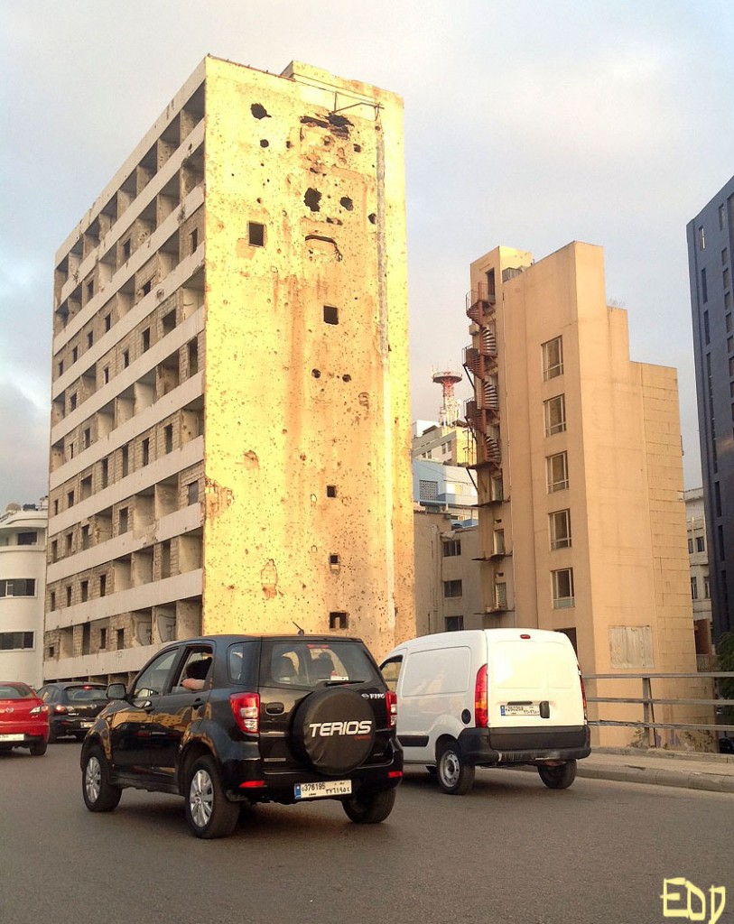 While running errands today in Beirut, I watched the light of the setting sun paint this wall–still riddled with bullet marks from the civil war–a bright golden hue…