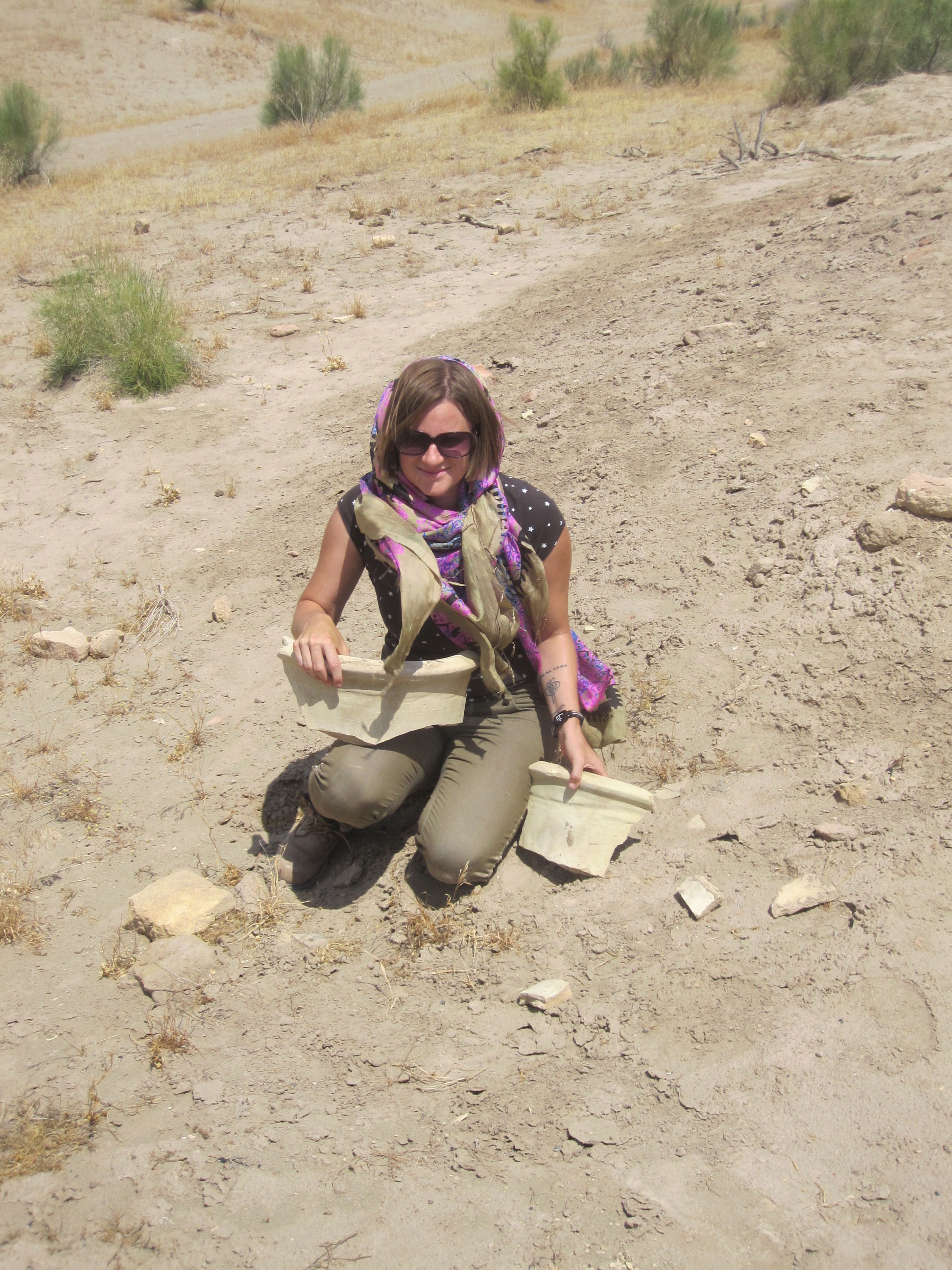 Emily O'Dell examining pottery on the Silk Road