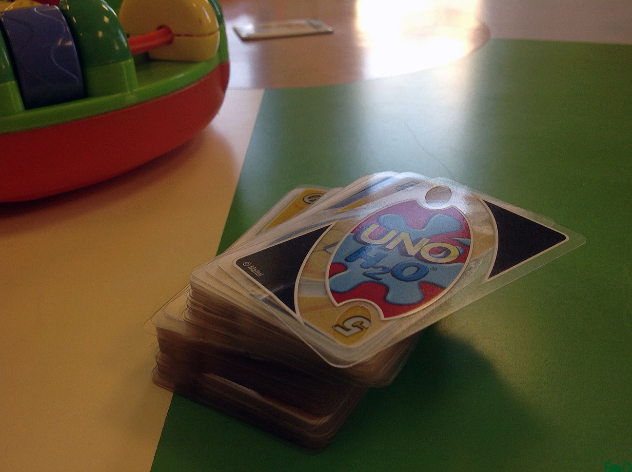 An answer to my problems! All year, while volunteering at St. Jude’s in Beirut, I’ve been playing UNO with the kids every week. And every other week, we get a new deck–because the cards get so tattered and worn. It’s almost impossible to shuffle the deck when the cards have become creased and ripped from overuse. So I was elated when I got to St. Jude’s today and found this deck of UNO H20 cards waiting for me on the table. Whoever thought of this solution to our UNO woes is an absolute genius. Not only do these UNO “water” cards not tear–their lamination allows for us to clean them with water or anti-bacterial spray if necessary–since germs can get passed around along with the cards. Shuffling these cards is such a joy compared to the frustration of shuffling a deck frayed at the edges. Today, the kids and I really enjoyed playing with these new cards which really make for a smooth game (even though I still got creamed)–and I highly recommend them for anyone with children, since they’re nearly impossible to bend and rip up…