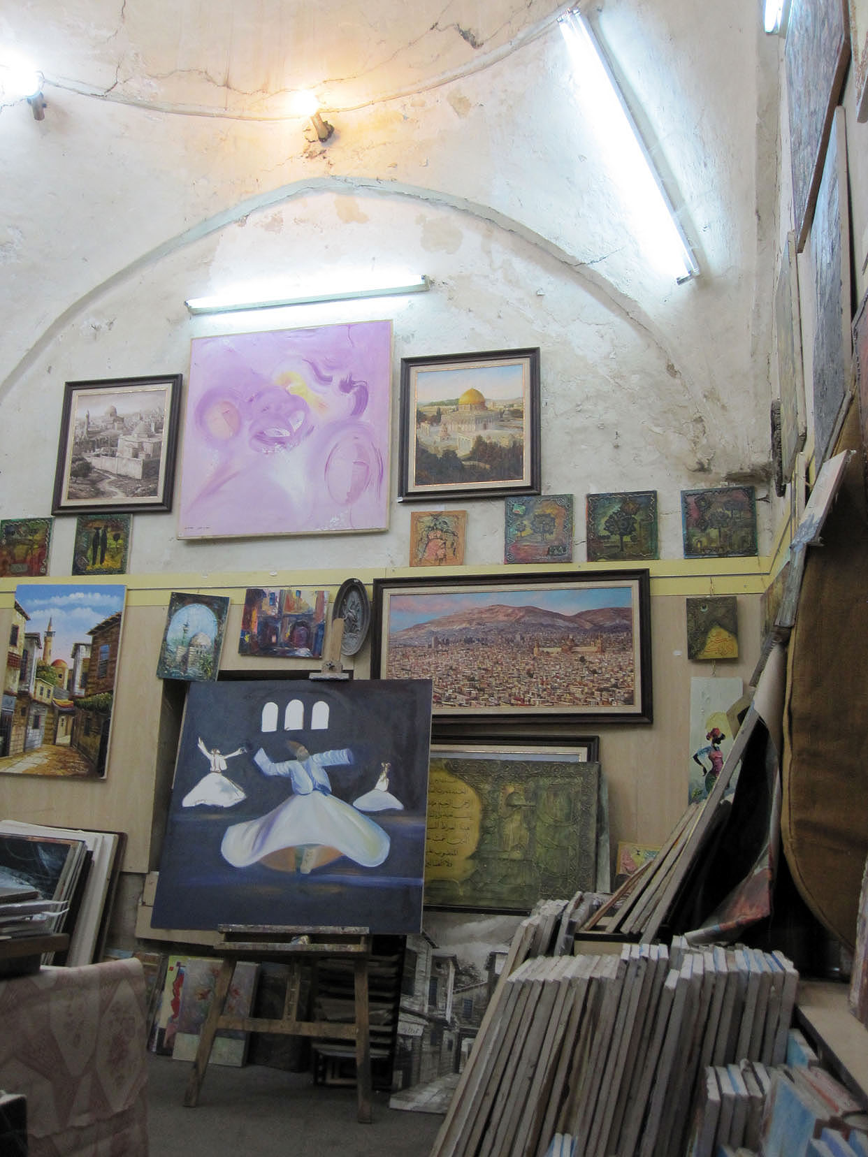 In my piece “Sharing the Sufis of Syria,” I included some photos of whirling dervish paintings that I took in Damascus. Those photos were close-ups, but here’s a whirling dervish painting displayed among other paintings in a shop at the Sufi complex I mentioned in an earlier post. If you look close enough, you’ll see something is missing…