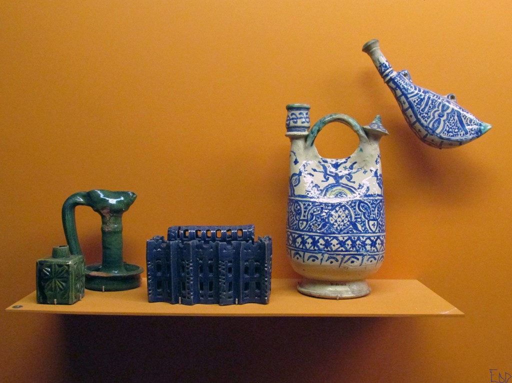 While visiting the American Museum of Natural History yesterday in New York, I was drawn to these ceramic objects from Morocco: an inkwell, a lamp, a pitcher in the form of a skin water-bottle, and a container in the form of a wooden flask.