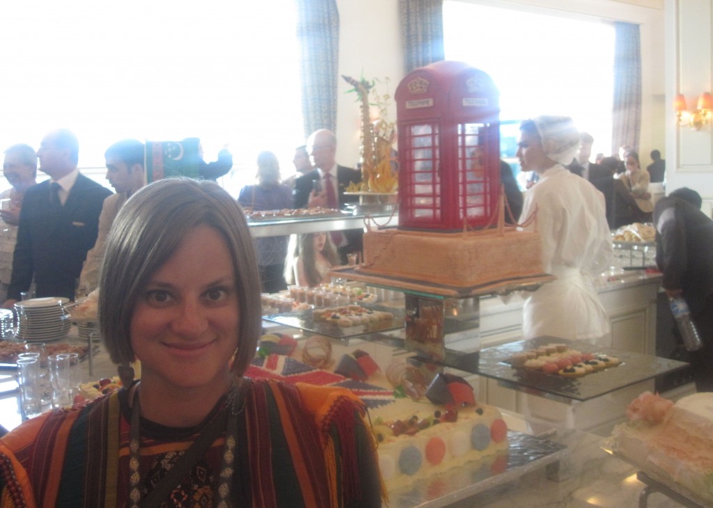 Last night, I had a truly lovely time celebrating the birthday of the Queen of England with ambassadors, diplomats and fellow archaeologists in Turkmenistan–and one of the best features of the evening, as you can see in the photo below, was the festive cake crowned with a red telephone booth!  Happy Birthday to Her Majesty!