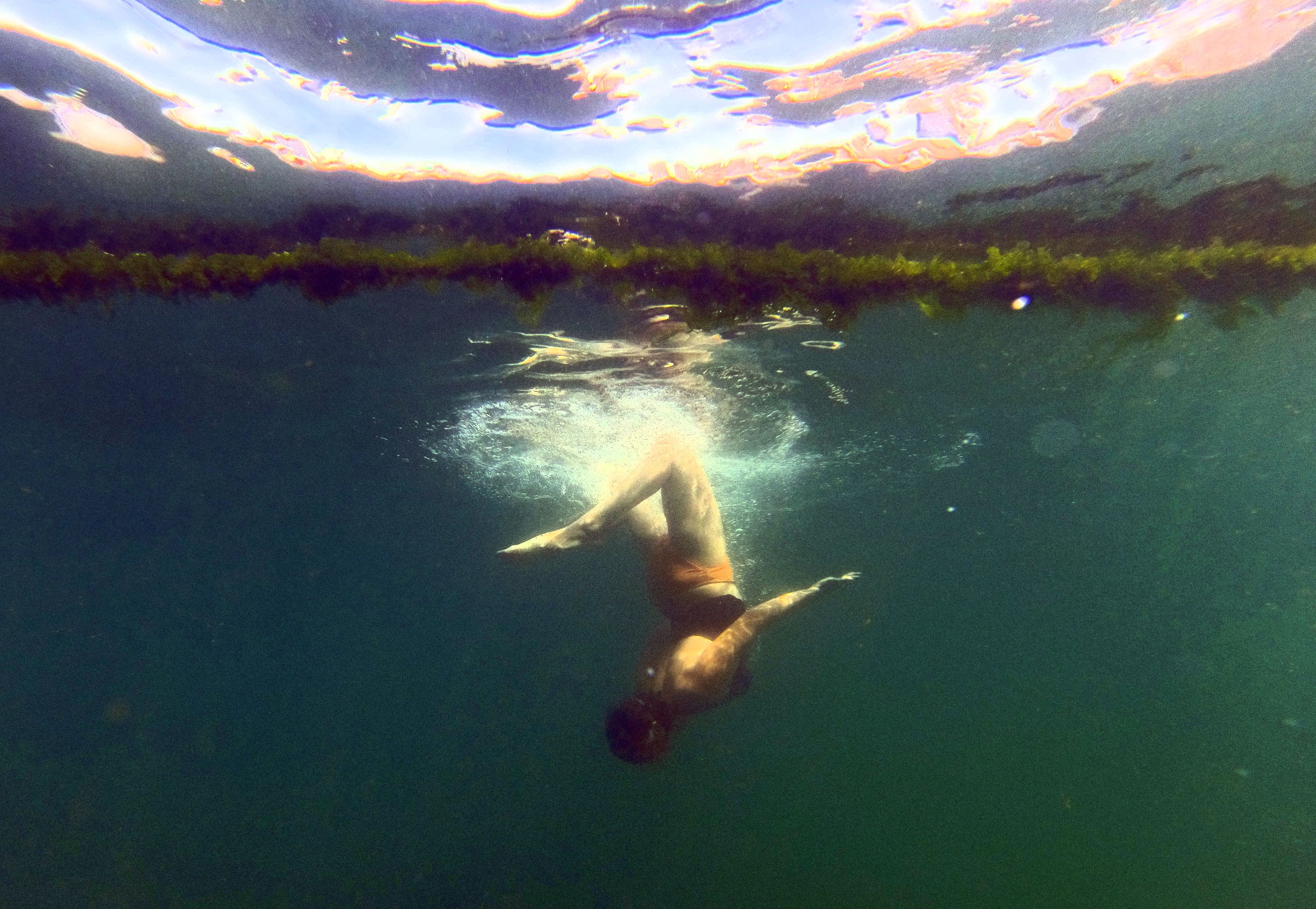 All year, I’ve been ignoring the worn rocks reaching under the water to break the surface–and only just started standing on them like a balance board–my body hovering like a ghost far out over the sea. Whenever a playful wave comes to buckle my knees, I resist its pull and keep my feet fixed on the pocked rocks–to slowly push up and rise again. Rooted and swaying, like the seaweed stroking my shins, I’m slowly becoming attuned to the message of each wave.