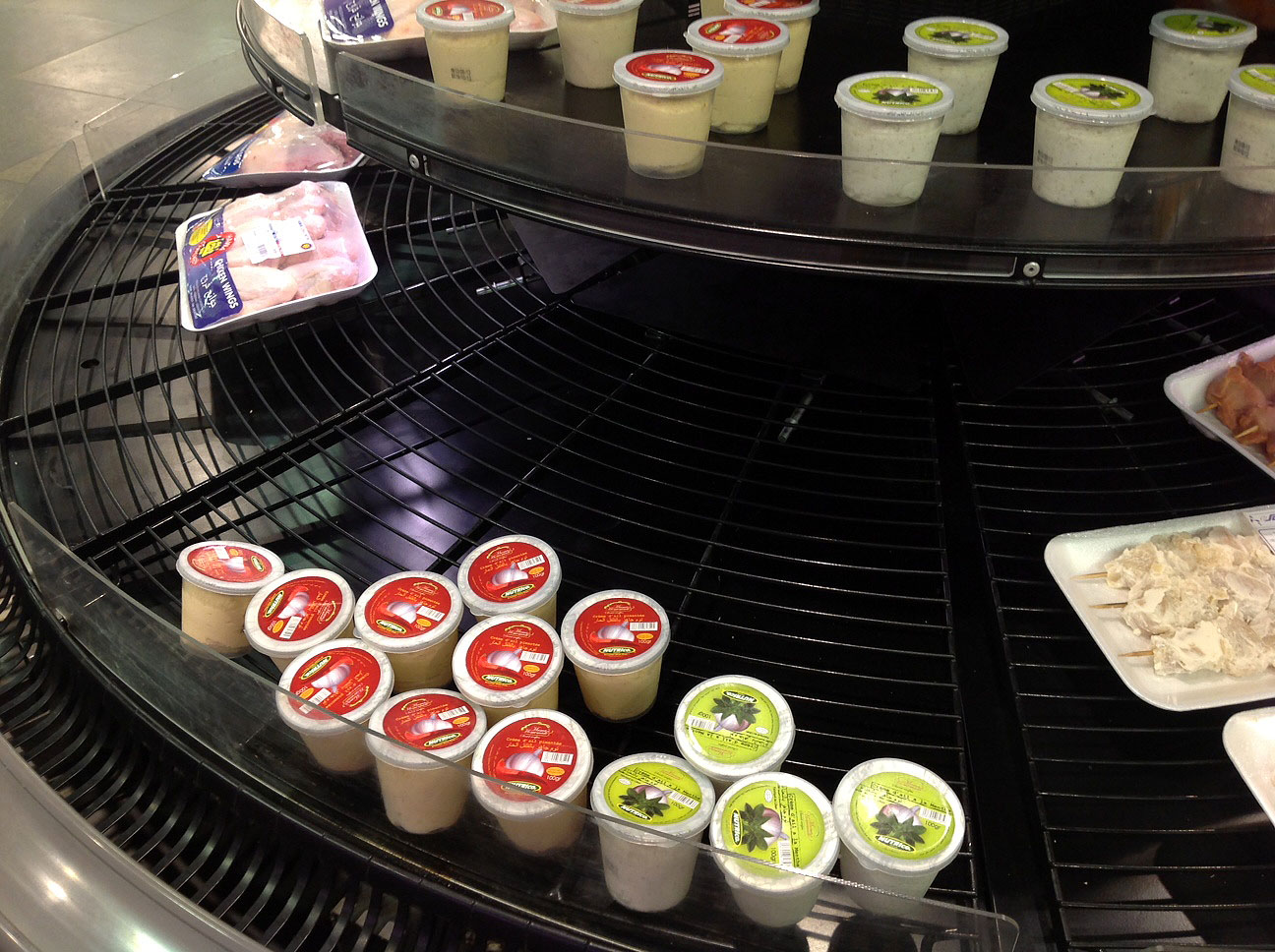 After picking up my beloved goat cheese in my cart, I wheeled my cart around to go fetch my weekly stash of Lebanese garlic sauce–which I eat almost every night with chicken. Only when I got to the shelf where it’s displayed–there was hardly any left.
