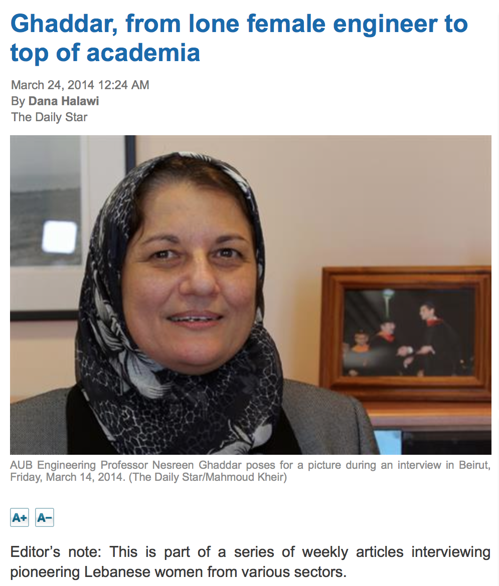 Dr. Nesreen Ghaddar, a professor of mechanical engineering at the American University of Beirut, went from being a lone female engineer to sitting at the top of academia. At AUB, Professor Ghaddar holds the Qatar chair of energy studies–and she’s vocal about the challenges that successful women face in both the academy and the professional world…